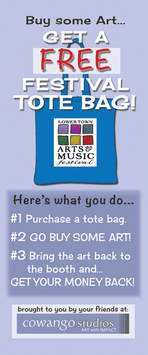 We want to kick off the art buying this weekend in a big way. You can get a free Lower Town Arts and Music Festival Tote Bag just by making an art purchase!